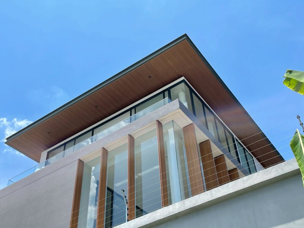 บ้านโมเดิร์นไม่จำกัดแค่การฉาบคอนกรีตเรียบแล้วทาสีเท่านั้น แต่ยังสามารถเลือกใช้วัสดุอื่น ๆ ได้เช่นกัน เช่น การออกแบบบ้านตามรูปทรงเลขาคณิตแล้ว เลือกใช้ไม้ระแนงตกแต่งแทนการทาสี และเลือกใช้รั้วต้นไม้ แทนการทำรั้วคอนกรีต เพียงเท่านี้ก็จะช่วยให้บรรยากาศบ้านดูเป็นมิตรแต่ยังคงความเป็นส่วนตัวได้ดี